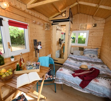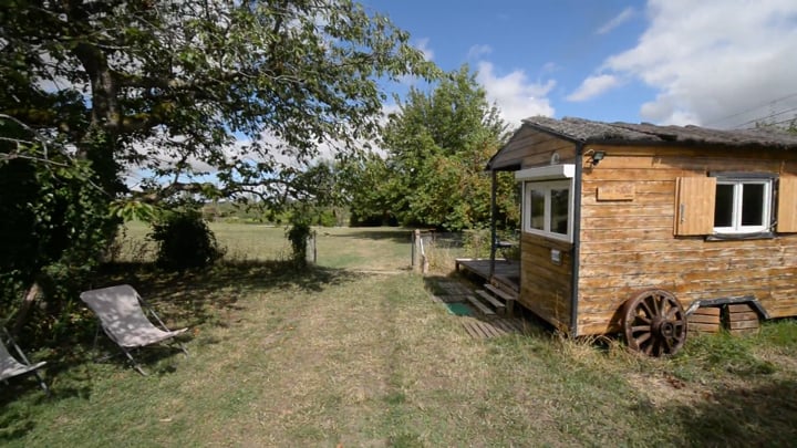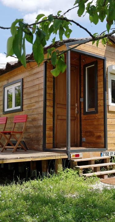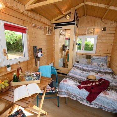 A mini wooden chalet with a panoramic view of the Loire. This unusual accommodation is equipped with a 130 cm bed, a kitchenette, a shower, a small air conditioner and a TV. The toilets are outside.