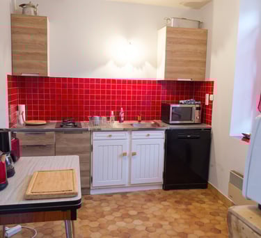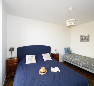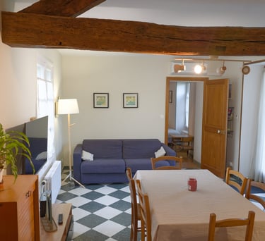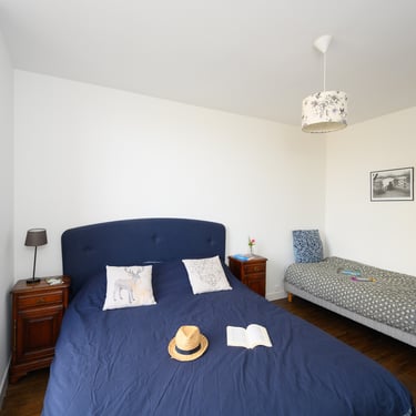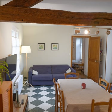 In the ground floor apartment (52 m²) which overlooks an interior courtyard, you will find a bedroom with a large double bed (160 cm), a bedroom with three single beds, a fully equipped kitchen open to the living room, a bathroom and toilets. The living room is equipped with a sofa bed. The equipment includes a dishwasher, coffee maker, toaster, kettle, large screen TV. Outside: a garden table, a barbecue and a laundry area with washing machine.